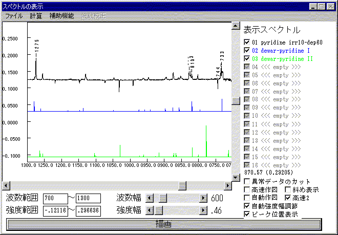 読込可能なスペクトルデータは,IRTOPCで変換済みのJASCO FT/IR-8000ファイル,JEOL JIR-7000.現在のバージョンでは,Gaussian94/98の出力ファイルの振動数データをスペクトルパターンとして表示することもできる.読み込み時には振動数と強度をExcelに適したフォーマットでクリップボードに転送する.