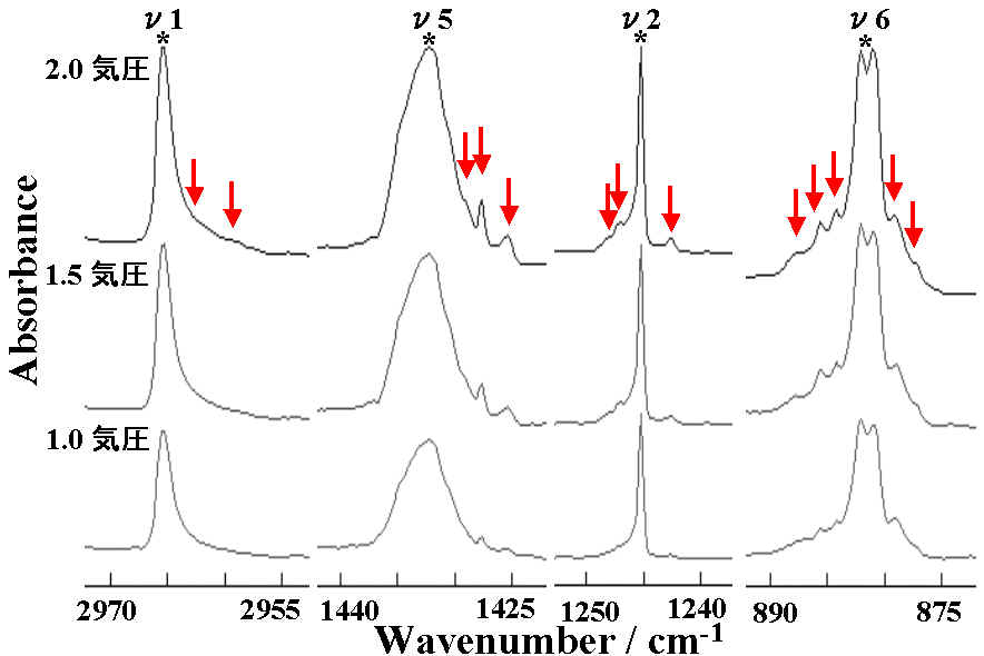 図1で表したスペクトルはヨウ化メチルの赤外吸収スペクトルです。何本かのピークが観測されています。これらのピークはヨウ化メチルの単量体のピークです。このピークの中でν1、ν2、ν5、ν6としたピークの周りを詳しく見ると、クラスターのピークを観測できます。