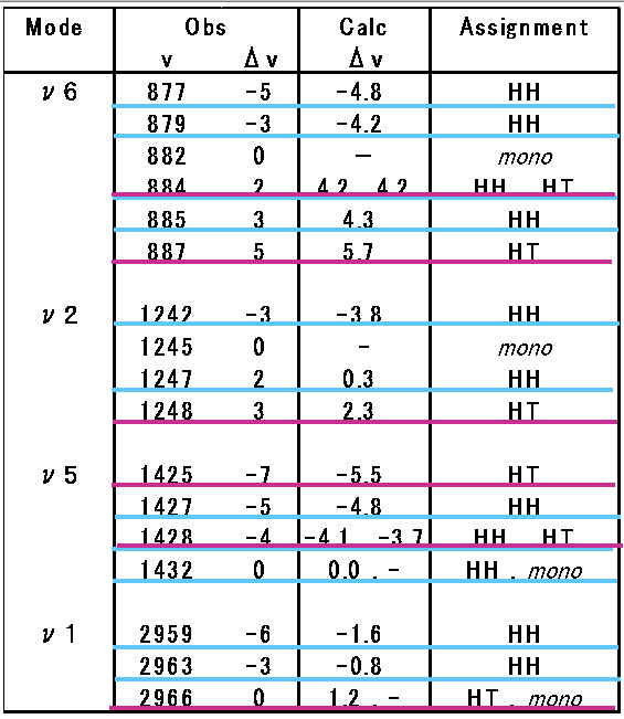 表1で実験値と計算値を比較しました。Δνは二量体構造をとったことによる単量体構造からの振動数の差です。観測されたピークは2つの構造の計算値で充分に説明ができました。このことから、実験で観測された二量体のピークは Head-to-Head と Head‐to‐Tail の2つの構造によるものであることがわかりました。