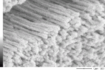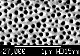今、最もホットな研究はナノテクノロジーです。どこを見渡してもナノテク、ナノテクで少しうんざりするくらいです。そんなメジャーなテーマに関連したことを研究室の誰かがやってみてもいいんじゃんというのがこの磁性材料の研究をはじめた理由です。 陽極酸化アルミナを作成して(左図)、その細孔に磁性材料をめっき法により埋め込んんでみました(右図)。まだ、成果というほど進んでいないのでこんな程度で。