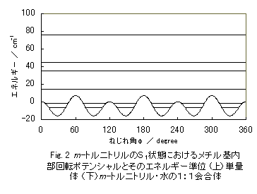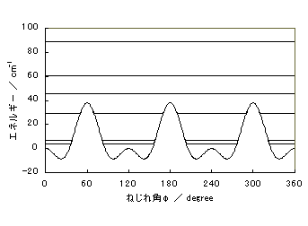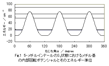 大振幅振動の一つに、メチル基の内部回転運動(ねじれ振動)があります。調和振動子で近似できる一般の分子振動とは異なって、メチル基内部回転のポテンシャルはsin関数やcos関数を用いて表されます。例として、5-メチルインドールのS1におけるメチル基内部回転ポテンシャルを図1に示します。