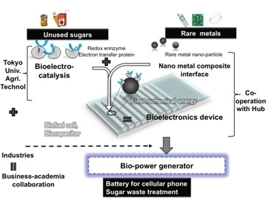 We focus on the development of “Bioelectro-catalysis” which is a key technology for “Green nano-bioelectronics”. Green nano-bioelectronics is a novel engineering to proceed Nano-bioelectronics in view of Green technology. To develop Bio-power-generator, we are planning to use unused sugars in various kinds of biomass for its energy source according to the following research plans and direction.