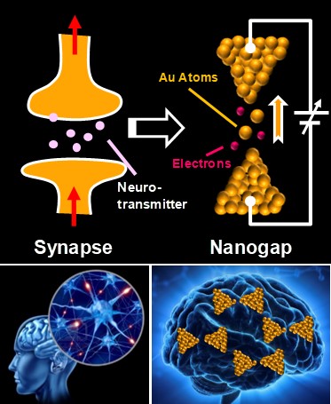 近年、ディープラーニングをはじめとする人工知能(AI)技術が著しく発展している。その中でも、ニューラルネットワークと呼ばれる、ヒトの脳における神経細胞系での情報処理を模倣したモデルを用いた機械学習手法が成果を挙げている。人の脳は、過去のイベントを記憶し、それらの経験から自発的に学習することで情報処理の方法(アルゴリズム)を自動獲得するシステムであり、工学的にはメモリベースアーキテクチャの非ノイマン型コンピュータであるといえる。このような情報処理は、ニューロンと呼ばれる神経細胞がシナプスを介して互いに結合された複雑なネットワークによって実現されている。人の脳では1010個程度のニューロンが、それぞれ1万個のほかのニューロンと結合を持つといわれており、非常に複雑な神経回路網を構成している。このニューロンとシナプスの特性を電子回路上に実装し集積化することで、エッジコンピューティング等に求められる脳型チップの実現が期待される。 これまで我々は、ナノギャップにおけるエレクトロマイグレーション現象を利用して、ナノギャップ構造の狭窄化が可能なアクティベーション法を提案してきた。本手法では、ナノギャップへの通電のみで、ナノギャップのトンネル抵抗のワイドレンジな減少制御や単電子トランジスタの集積一括作製が可能であると報告されている。本研究では、本手法をAuナノギャップに対して適用し、トンネル抵抗制御を利用したシナプス動作と、シナプス動作のダイナミクスを応用して機械学習の一種であるリザバーコンピューティングの実装を検討した。 シナプス動作の検討では、脳神経系においてニューロンによって発生する活動電位を模擬したスパイク型の通電をAuナノギャップに対し適用した。これにより、Au原子のアクティベーションが誘起され、ナノギャップのトンネル抵抗が通電に伴い連続的な変化を示した。さらに、このトンネル抵抗変調の特性が、生体シナプスに見られる短期可塑性(Short-Term Plasticity: STP)から長期可塑性(Long-Term Plasticity: LTP)への遷移や、活動電位のタイミングに応じたシナプス可塑性であるSpike-Timing-Dependent Plasticity(STDP)を模擬できることが確認された。また、AuナノギャップにおけるSTPダイナミクスがリザバーコンピューティングに要求される特性を持つことを利用し、5×4ピクセルサイズの数字画像パターンの認識が可能であることが示された。 以上の結果より、本手法を適用したAuナノギャップがシナプス可塑性を発現することが示され、ヒトの脳機能を忠実に電子回路上に実装したニューロモルフィックシステムへの応用が期待される。さらに、シナプス動作を利用したリザバーコンピューティングによって簡単な認識タスクが可能であることが示唆された。これにより、現在のニューラルネットワークを基本とした人工知能技術のハードウェア実装への応用の可能性が示された。Neuromorphic computer chips, which use artificial neurons and synapses designed like those in our brains, could help revolutionize future autonomous computing and artificial intelligence systems. Research groups have developed and demonstrated single artificial synapses, but no one has tested a device that combines multiple synapses. Sakai et al. have demonstrated an artificial synapse device combining multiple synapses for the first time. The researchers connected multiple single synaptic devices created from previously developed gold nanogap electrodes into an array. The simple design of the electromigrated electrodes was chosen for their ease of fabrication. The researchers activated the artificial synapses by applying a field emission current to emulate synaptic functions before testing. Testing the connected device, which was structured like an axon linked by two synapses, showed conductance changes in response to a stimulation voltage, mirroring how memory functions in biological synapses. "In the study we showed that a synaptic device of gold nanogaps can implement significant synaptic functions, notably short-term, long-term, and spike-timing-dependent plasticity," said author Jun-ichi Shirakashi. "This shows that synaptic learning behavior can be emulated not only by a single gold nanogap, but also by a multiple connected gold nanogap." The authors' results show such devices could be integrated in large-scale systems, which could enable the processing of more complex neuromorphic functions including pattern classification and image recognition. The authors plan to use such gold nanogap devices to continue studying tasks like Pavlovian conditioning and axon-multi-synapse networks with multiple connected nanogaps.