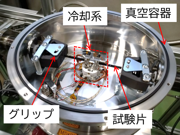 研究室ではJAXAと共同で極低温試験装置の開発に取り組み、ヘリウム冷凍機を適用することで小型の試験片を30K(-243℃)まで冷却することが可能な引張り試験機を新たに開発しました。