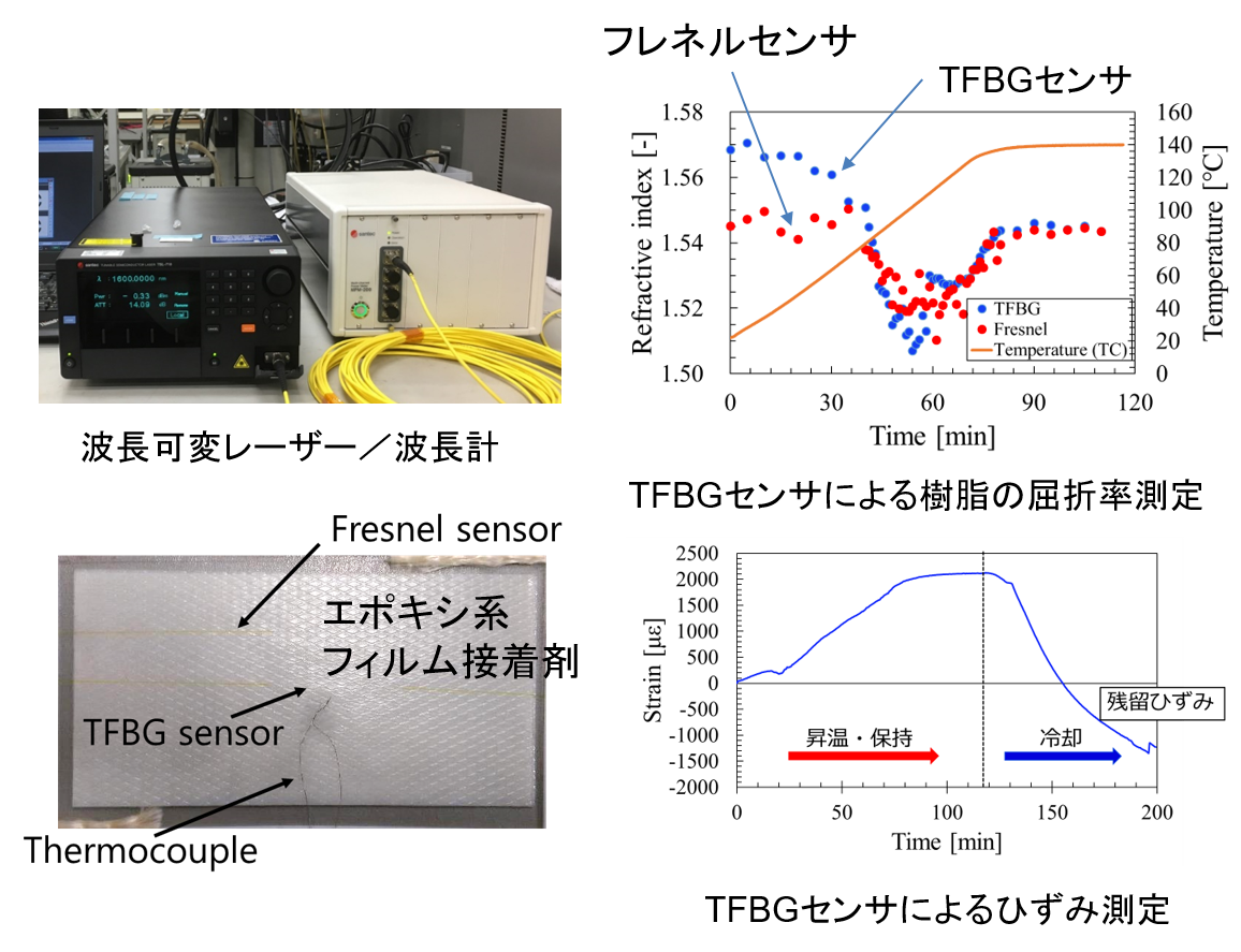 一般に成形モニタリングでは、温度・ひずみ・樹脂硬化度が計測されます。そのため、温度センサ(熱電対等)、ひずみセンサ(FBG光ファイバセンサ等)、樹脂硬化センサ(誘電センサ等)を用いて、別々に測定されます。研究室ではJAXAと共同で、傾斜型FBGセンサ(TFBGセンサ)を適用することで、1つのセンサで、温度・ひずみ・樹脂硬化度を同時に、同一部位で測定することを目指した研究を進めています。測定精度に関しては課題もありますが、センサ単体およびエポキシ樹脂フィルム接着剤やCFRP積層板の成形モニタリングによって、温度・ひずみ・樹脂硬化度の同時測定に関する検証を進めています。