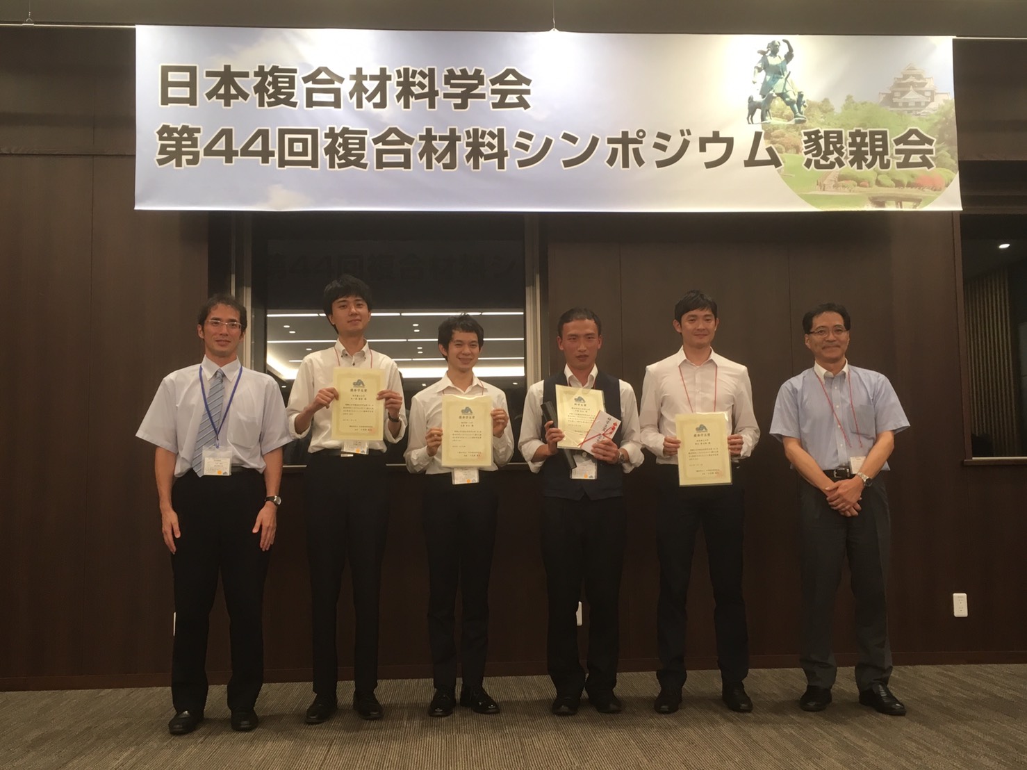 岡山理科大学(岡山市)で開催された日本複合材料学会主催の第44回複合材料シンポジウムにおいて、D3 大島さん、D1 五十嵐さん、神山さん、M1