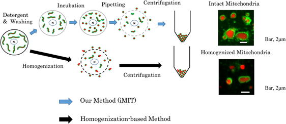 そこで、私たちは、細胞をホモジェナイズや可溶化することなく、外膜が内膜を取り囲んだミトコンドリアが大多数を占めるミトコンドリア集団を得る方法(iMIT)を開発しました。