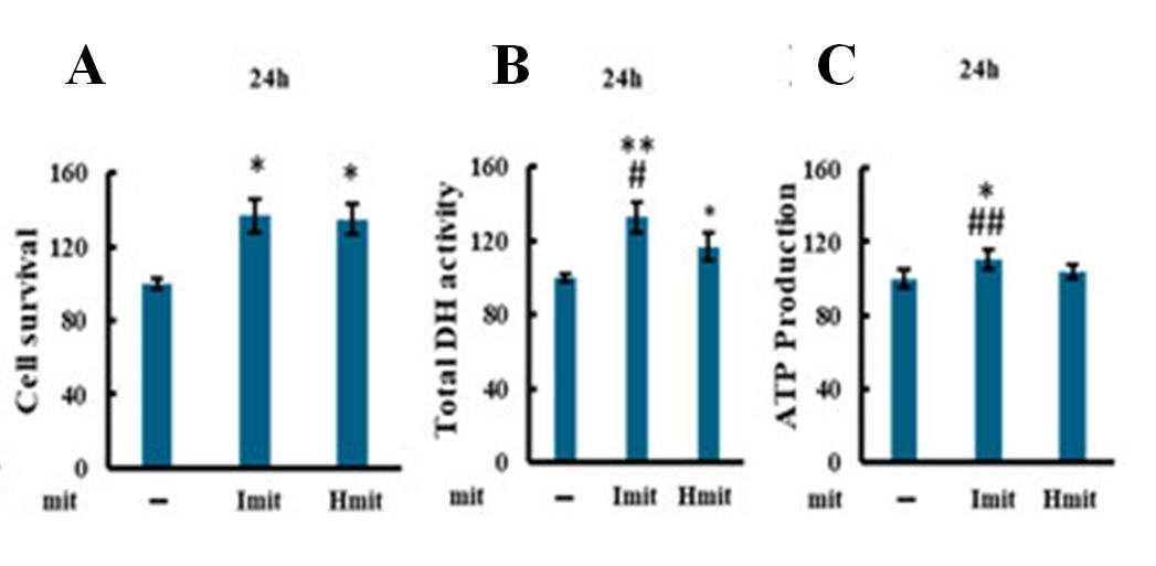 上のA―Cは、酸化ダメージを受けた細胞にミトコンドリアを添加しない場合(-)と添加した場合(Imitが無傷のミトコンドリア、Hmitが外膜にダメージを受けたミトコンドリア)で、細胞の回復を比較したものです。