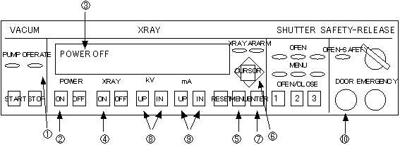 1.X線発生装置のパネルを上に示す。OPERATE@ランプが点灯していることを確かめて POWER ONAボタンを押す。