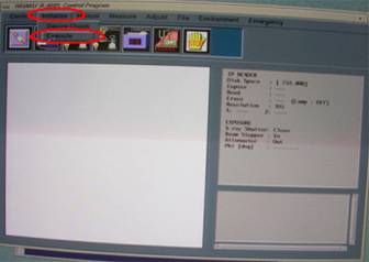 2. 画面Bに READY NOW の表示が出たことを確かめて XRAY ONCボタンを押す。ランプが点灯して 20 kV, 10 mA の出力で X 線が発生する。 READY NOW の表示が出ない場合、その原因としては防護カバーのどこかが開いている可能性がある。防護カバーを全てチェックしてなおかつ READY NOW の表示が出ない場合はシステム管理者まで連絡する。