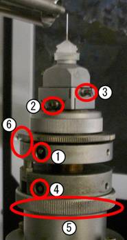 5. ゴニオメーターヘッドを回転させ、AおよびBのネジで水平方向を、ネジCを緩めDのリングで縦方向を調整する。