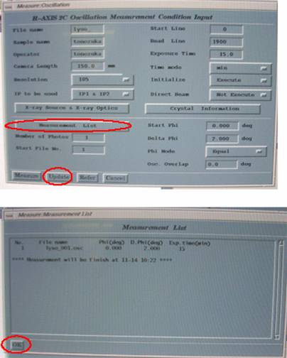 6. Measure → Oscillationより Oscillation のウィンドウを出し、同様の手順でFile name、Sample name、Operator、Exposure time(例えば60分)、Number of Photos(例えば45枚)、Start File No.(通常1)、Start Phi(例えば 0)、Delta Phi(例えば2度)を入力する。