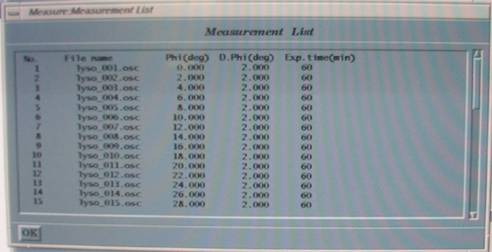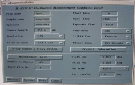 2. File name、Sample name、Operator、Exposure time(ここでは15分程度)、Number of Photos(ここでは1枚)、Start File No.(ここでは通常1)、Start Phi(通常0)、Delta Phi(通常1〜2度程度)を入力する。これら以外の設定はデフォルト値でよい。