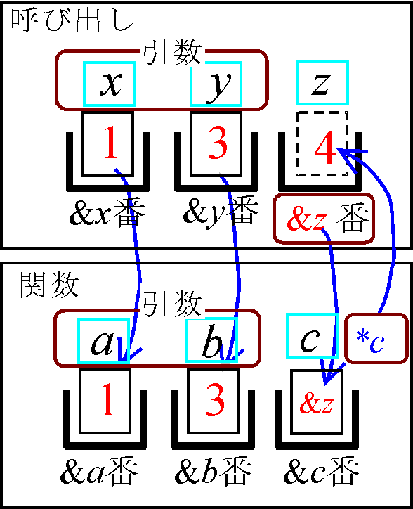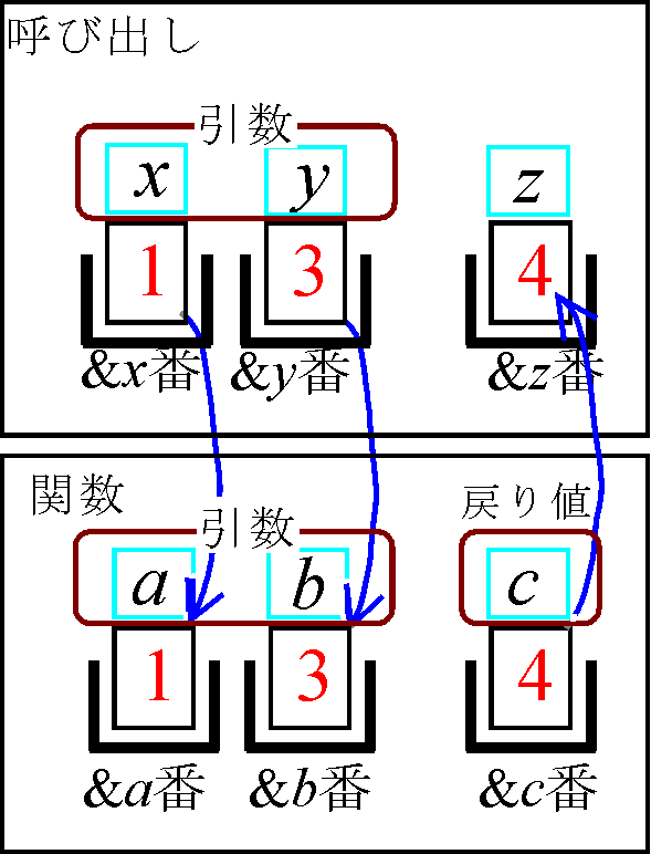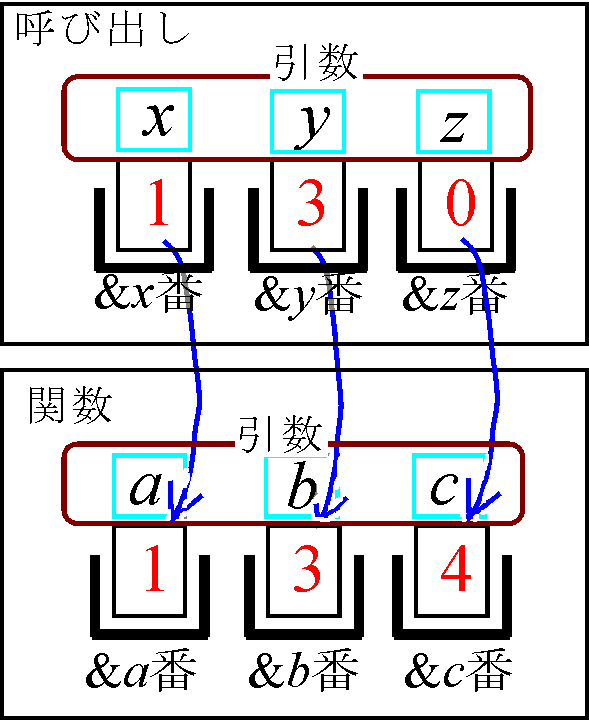 上記例題の関数呼び出しにおけるデータの受け渡しを、箱モデルを用いて示したのが以下の図です。