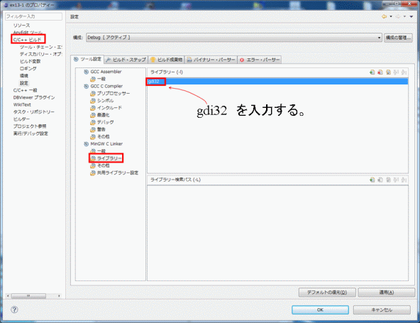 以下の手順に従って、グラフィックライブラリ:gdi32.lib をリンク指定する。