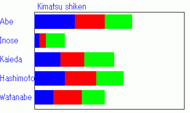 ![]() (2)下図のように、折れ線グラフを追加してみてください。 ![]() (3)余力のある人は、合計点を、下図のように各科目の得点ごとに色分けして表示させてみてください。 ![]() [補足説明] 文字表示には、G_TEXT() を使ってください。使い方は関数表の説明をみてください。表示可能な文字は半角文字(アルファベット英数字)だけでなく、全角の日本語文字も表示できます。 |