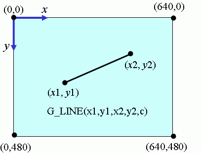 | void G_LINE(int x1, int y1, int x2, int y2, int c) | 始点(x1,y1)、終点(x2,y2)の2点間を、色番号cの色の直線で結ぶ。ここで、色番号は下表に示す約束の色を表す。 |