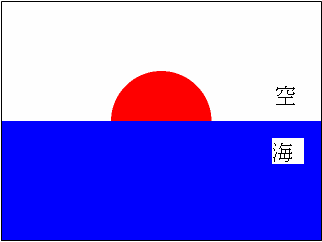 | 演習問題13-1 (Revised : 2011/12/28) 例13-1のプログラムを実行して、グラフィック関数の使い方を覚えてください。 その際、空の色をマゼンタに塗りつぶし、黄色の三日月も太陽の右上か左上に一緒に描いてみてください (天文学的にはありえない構図ですが、単に演習としてやってください)。 |