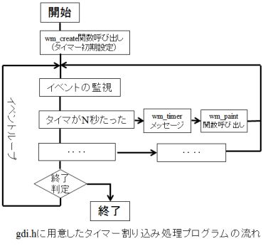 OSや並列動作している他のアプリケーションとの間で干渉しないようにしながら、一定時間間隔ごとに画面を書き換える必要があることです。幸いなことに、本演習で用いているGDIライブラリ(WINDOWS