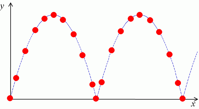 (2) 時間tをTdelの時間づつ増やしていきながら、ボールの運動軌跡を画面に描く。まず、ボールが地面に着地するまでの軌跡を描くよう時間を設定する。1回の跳ね返りまでの時間(地面に着地するまでの時間)Tlandが、