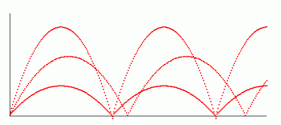 | 演習問題 14-3 (Revised : 2017/1/5) (1) 以上の描画プログラムは、ボールが地面に衝突した際のエネルギー損失(弾性損失や摩擦損失)を考えていないため、永遠にボールが運動してしまい、不自然です。以下の補足説明に従って、跳ね返える度に少しずつボールの勢いが弱まっていき、やがてボールが止まるようなプログラムに改良してください。打ち上げ角度と跳ね返り係数を、何例か試した結果をレポートにしてください。 補足説明 考え方: エネルギー保存則により、エネルギー損失がなければ、跳ね返り後も、 x方向: vx0=v0*cosθ y方向: vy0=v0*sinθ の初期速度を保ったまま、θ方向にボールが打ち上げられる運動を、何回も繰り返す。 これに対して、 衝突時に損失がある場合は、跳ね返り係数をBf(Bfは0〜1の係数)として、次式のように、跳ね返る度に、打ち上げ速度V0をBf倍に小さくする。 x方向: vx0 ← Bf*vx0 y方向: vy0 ← Bf*vy0 実現方法: ○ボールの着地判定処理ルーチンに、以下の処理を追加する。 ・x方向の初期速度vx0をBf倍する。 ・y方向の初期速度vy0をBf倍する。 ○プログラムの最初で、打ち上げ角度Thetaの入力に加えて、跳ね返り係数Bfをキーボードから入力して、変更できるようにする。 (発展問題) 余裕のある人は、さらに以下の課題をやってみてください。 (2)上記のプログラムでは、ボールがそれ以上跳ね返らなくなるとボールが途中で止まってしまいます。ボールが止まっている場合は、最初に戻って同じ処理を繰り返すようにするにはどうしたらよいでしょうか。 ヒント: Y1>=Ymax でなおかつCount==@@@ の時、ボールが止まっていると判断して、最初に戻る(wm_createを呼び出す)処理をする。レポートには、ボールの運動に伴う(跳ね上った後に着地した、あるいは跳ね上ることなく着地状態が続いている(止まっている)のかの違い)Countの値の変化に着目し、上記条件式にCount==@@@ の条件を課す理由(Count<=@@@ では駄目?)について考察せよ。 (3) ボールの軌跡を線で結んだ線軌跡を描くプログラムを作ってください。 ヒント: ERASEをFALSEにして、一回前の画像を消さないで残す。一方、現時刻のボールの位置(X1,Y1)に加えて、直前時刻のボールの位置(Xb,Yb)を保存しておく(wm_paintの最後に、Xb=@@@; Yb=@@@; を加える)。その上で、(Xb,Yb)と(X1,Y1)の2点間を直線で結ぶ関数G_LINEを呼び出すようにすればよい。 |