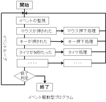 (補足) イベントには、『キーボード入力』、『マウス入力』、『タイマー割り込み』などがあります。Windowsアプリケーションプログラムは、これらのイベントが発生したら何かを行うという方式のプログラムです(図を参照)。これをイベント駆動型プログラムと言います。そのプログラムの動作は、コンピュータのOS環境の中でどのようなイベントが発生するかに依存します(並行して走っている他のプログラムによってプログラムの実行順序が変化する)。これによって、WindowsOSと協調しながら、アニメーションのような一定時間間隔で動作するプログラムの実行が可能になります。これに対して、今までの第12回までの演習で習ってきたプログラムは、予め決められた順番に従って命令を実行する逐次実行型のプログラムです。このプログラムは単体の動作しか考えていませんので、途中で他のプログラムが割り込んだ場合、アニメーションがそこで一時停止してしまう不都合を生じます。