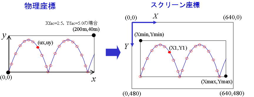 スクリーン座標の(Xmin=60,Ymin=150)と(Xmax=560,Ymax=350)の2点を対角とする四角の中にグラフを描く。そのために、ボール位置の物理座標(ux,uy)を、次式に従ってスクリーン座標(X1,Y1)に変換する。