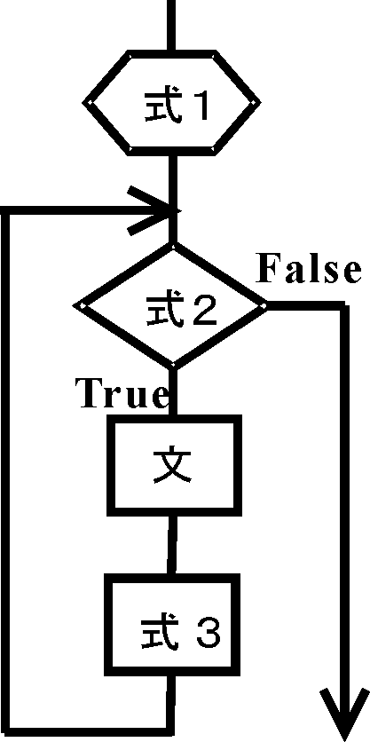 for文は、(式1; 式2; 式3)の条件に応じて、{…}の中の実行文を繰り返し実行します。ここで、(式1; 式2; 式3)の条件式は、フローチャートに示すように