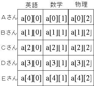int sugaku[5]={60,60,90,100,70};この時、各科目の平均点、最高点、最低点、標準偏差を計算したり、各個人ごとの全科目の合計点を計算する場合を考えてみます。そのために、上記のように科目ごとに3つの一次元配列変数を用意してプログラムを作ってもよいのですが、科目数が多くなると大変になってきます。