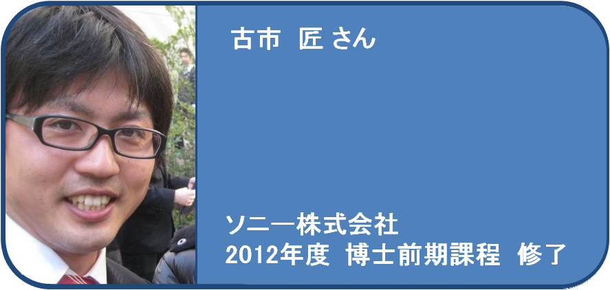 2012年修士卒の古市です。現在は、ソニー株式会社で無線通信の研究業務を行なっています。