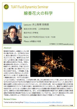 戦国時代後期に,火縄銃とともに黒色火薬が伝来した。江戸時代になると,黒色火薬を用いて花火が作られるようになった。線香花火は,わずか0.1gの黒色火薬と和紙からなる最も単純な玩具花火である。同時に,最も馴染み深い花火の一つであろう。紙縒りの上端を持ち,下端に点火すると,火薬が勢い良く燃えてオレンジ色の火球ができる。一呼吸置いた後,火球から四方に飛び出した火花が,遠方でパッと弾けて,松葉状の美しい模様を描き出す。やがて火花は弱々しく出ては消え,一生を終える。この独特の儚い美しさは,数世紀にわたって親しまれてきたものの,なぜ火花が出るのか?なぜ火花が破裂するのか?なぜ独特の色味が表れるのか?といった,誰もが思う素朴な疑問への答えは明らかにされてこなかった。2012年8月以降, 我々は,高速度可視化計測や熱分析,理論解析を行うことで,長年の謎の一端を解き明かすことに成功した。講演では,線香花火研究を始めるきっかけになった映像や,初めて撮影された火花連鎖分裂の高速度可視化結果などを紹介しながら, 線香花火の美の物理を解説する。また, 火花は溶融塩液滴の軌跡であり,線香花火現象の律速過程が液滴内部の熱拡散であることなど,理論的側面について述べる。あわせて,横浜国立大学と共同で実施した熱分析によって特定された,液滴連鎖分裂を引き起こす物質ついても紹介する。