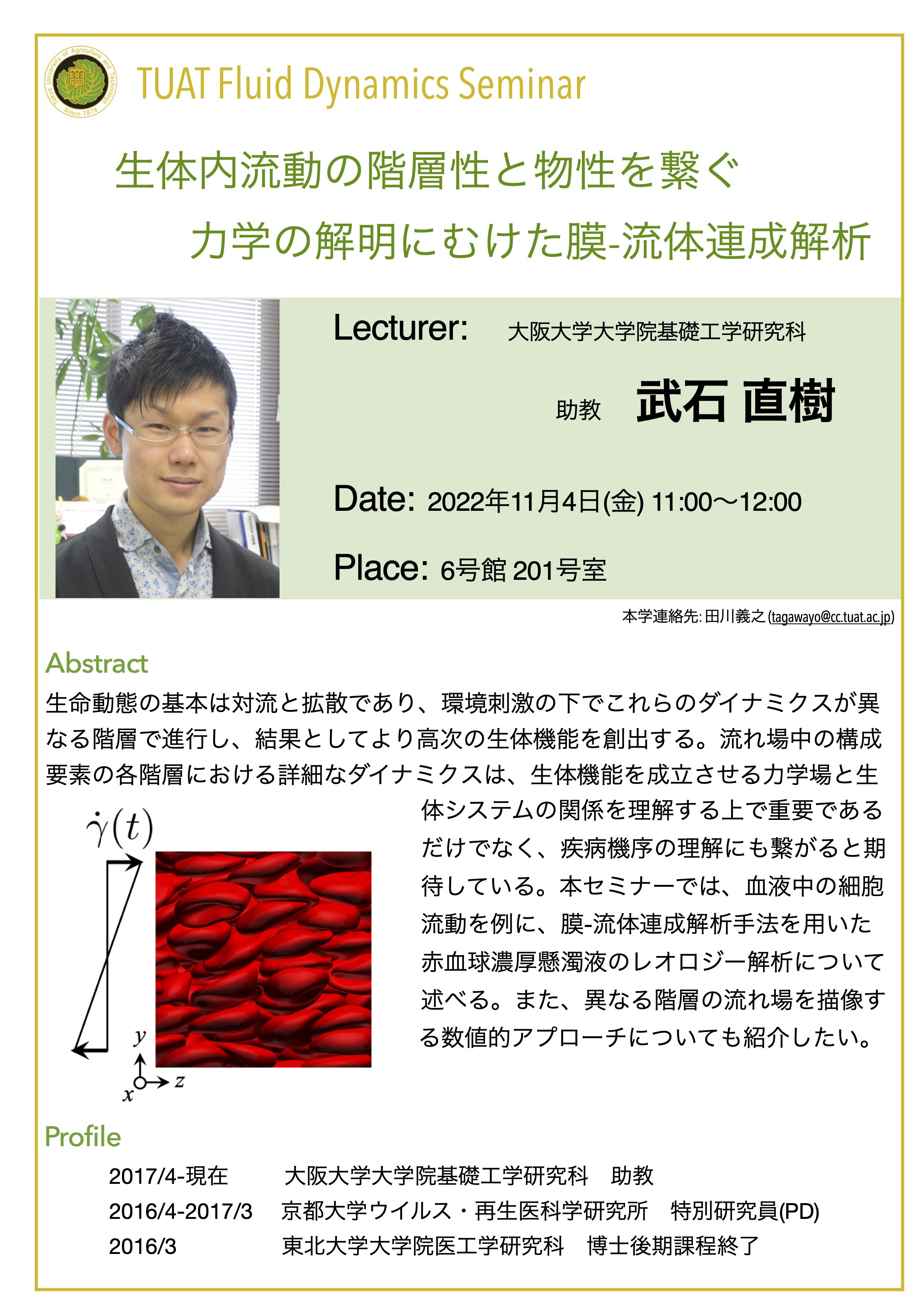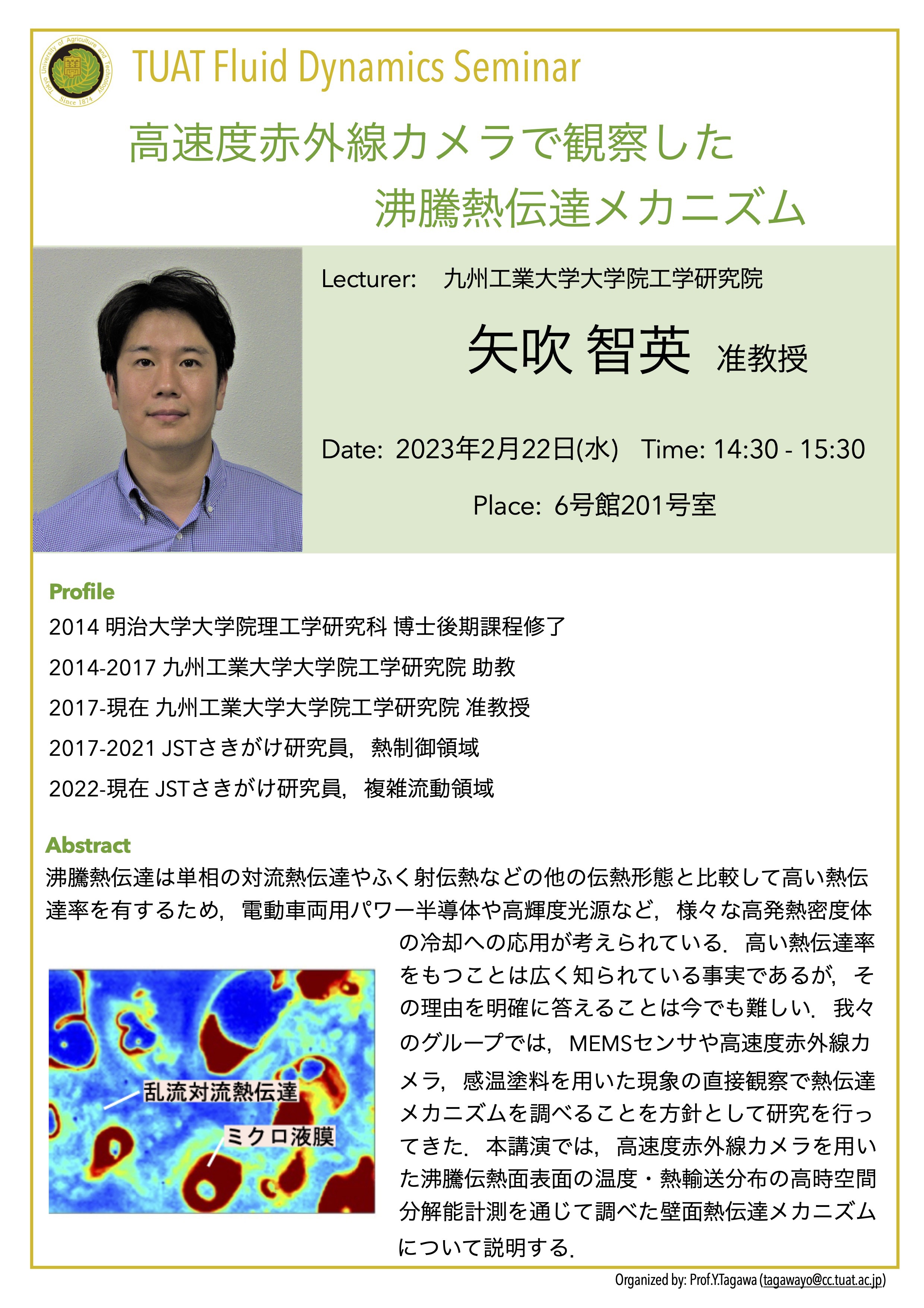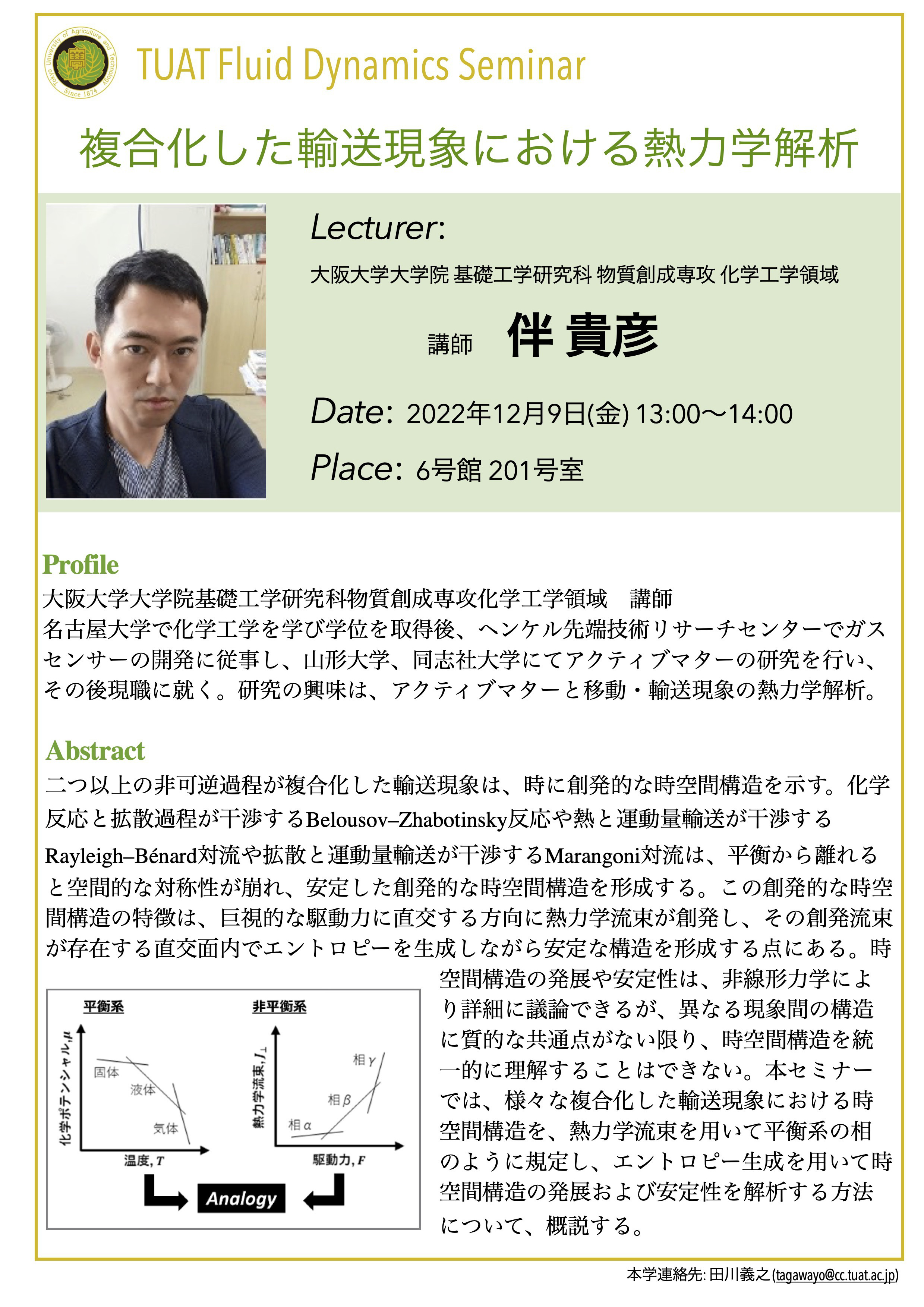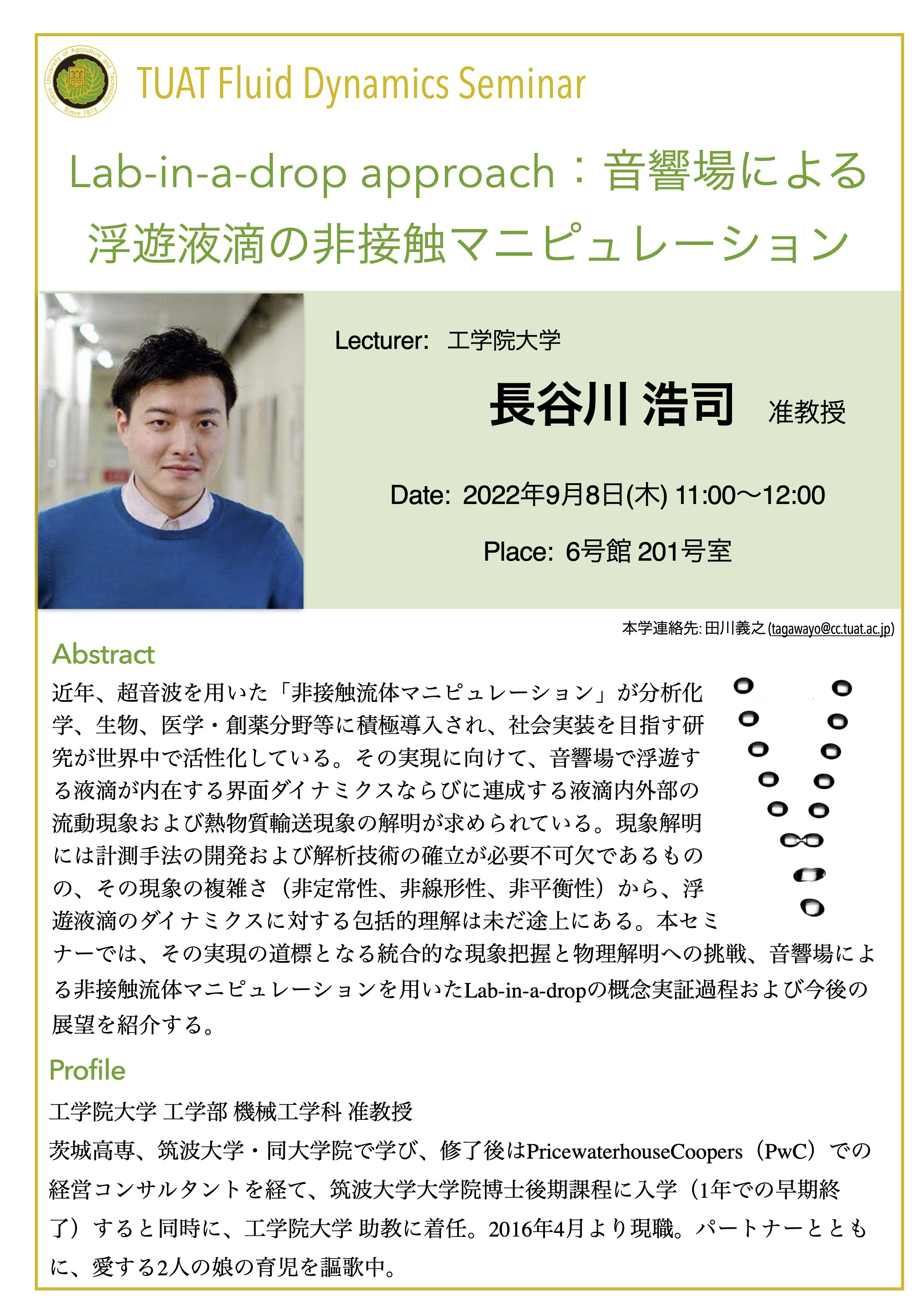 分野横断研究を始めるきっかけとなった研究者初期の頃を振り返り,熱流体工学を専門とした学部・ 大学院時代や,海外の大学でPh.Dを取得した後帰国し分野横断をしてマイクロロボットの研究室へポ スドクとしてリスタートしたことなどを通して,研究者にとっ て重要なことは何か?日本でのキャリア形成,異分野の研究者 同士のネットワークの大切さについてお話します.後半は電界 誘起気泡を用いたインジェクターの研究のお話と分野横断研究 への展開のお話をします.個人研究(さきがけ)からチーム型研 究(CREST,ムーンショット)へシフトしていく中での様々な価 値観の考え方,纏め方などのお話ができればと思います.最後 に機械と生物と情報などの分野を繋げていく試みのプロジェク トの紹介をいたします.