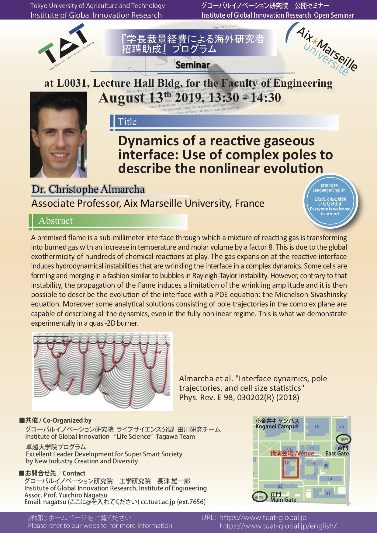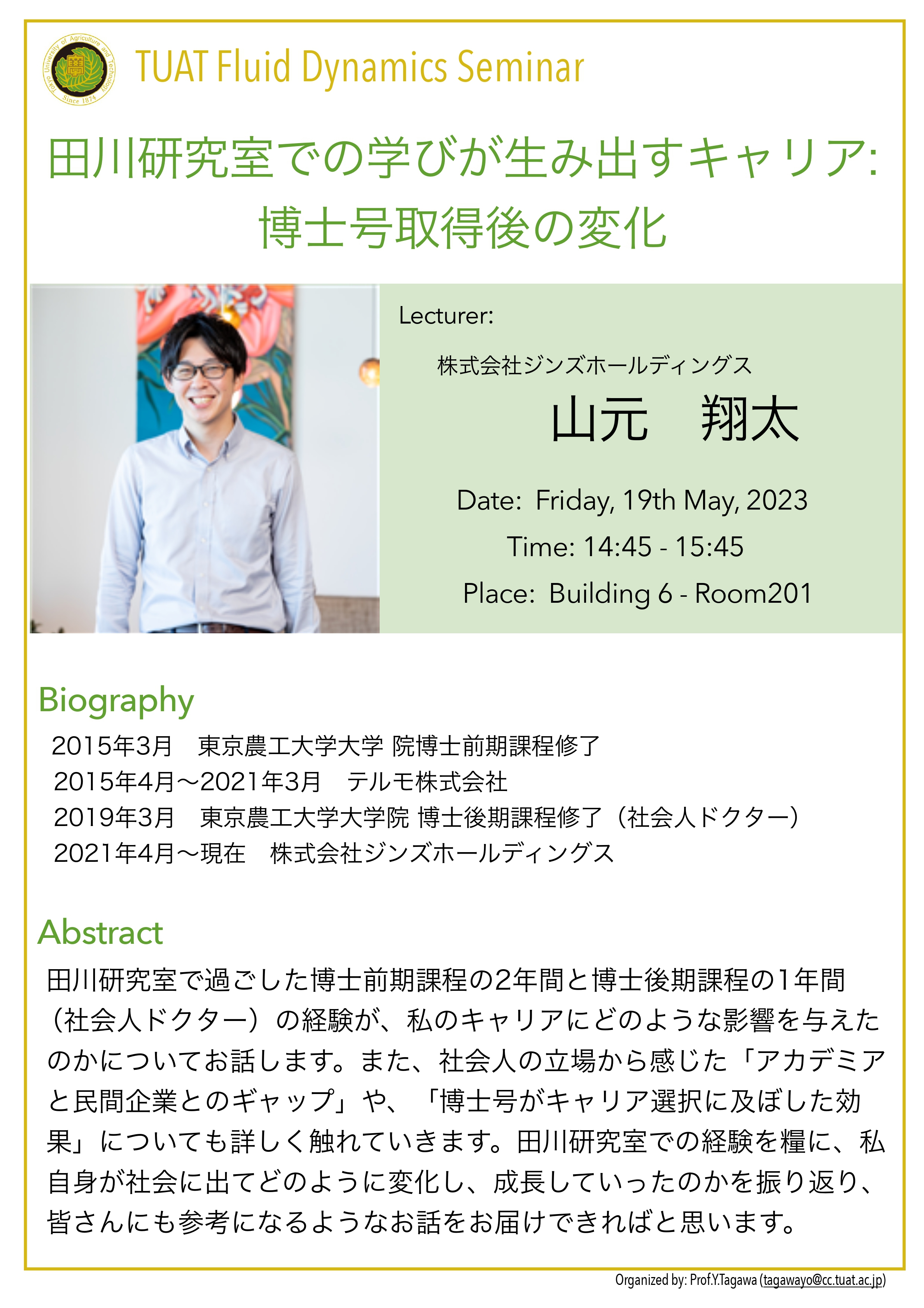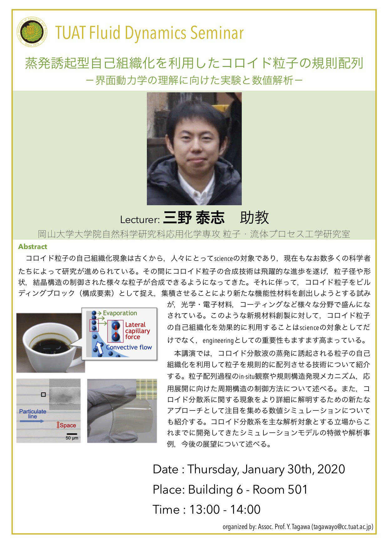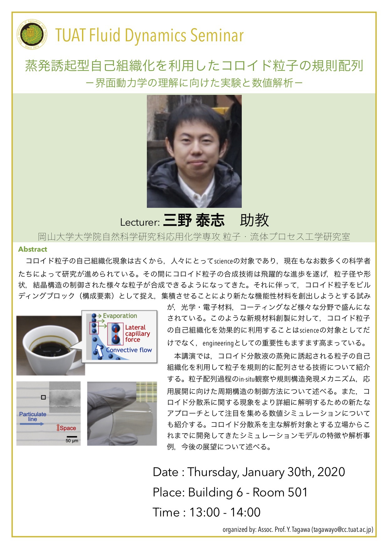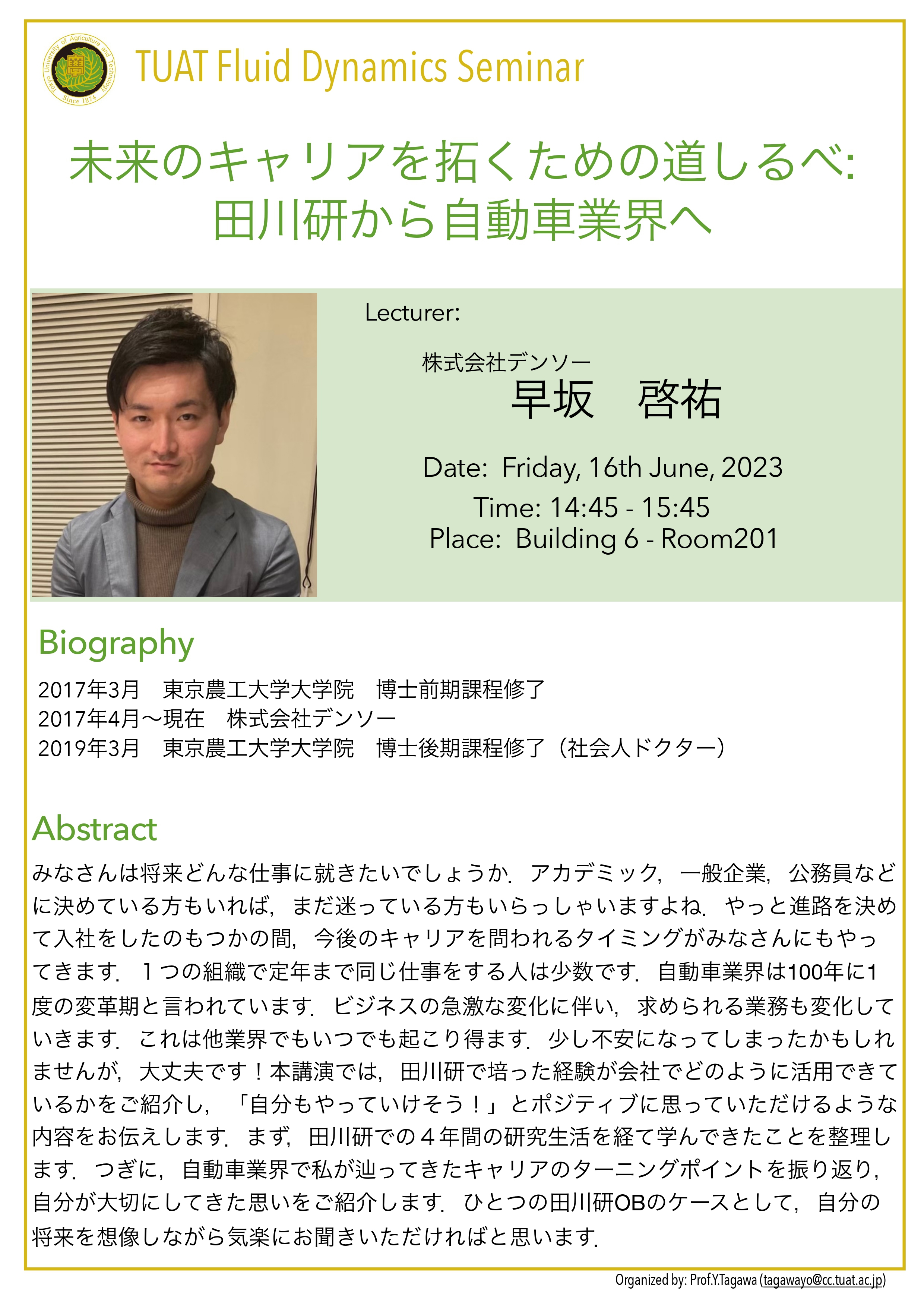 分野横断研究を始めるきっかけとなった研究者初期の頃を振り返り,熱流体工学を専門とした学部・ 大学院時代や,海外の大学でPh.Dを取得した後帰国し分野横断をしてマイクロロボットの研究室へポ スドクとしてリスタートしたことなどを通して,研究者にとっ て重要なことは何か?日本でのキャリア形成,異分野の研究者 同士のネットワークの大切さについてお話します.後半は電界 誘起気泡を用いたインジェクターの研究のお話と分野横断研究 への展開のお話をします.個人研究(さきがけ)からチーム型研 究(CREST,ムーンショット)へシフトしていく中での様々な価 値観の考え方,纏め方などのお話ができればと思います.最後 に機械と生物と情報などの分野を繋げていく試みのプロジェク トの紹介をいたします.