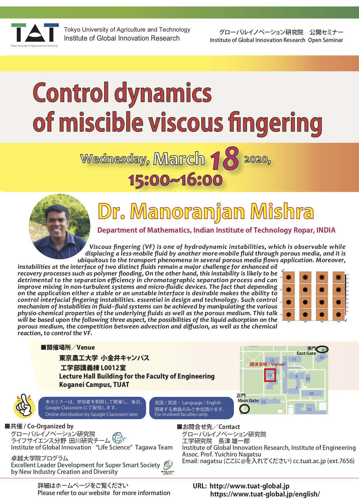 In this talk, I will demonstrate how to alter macroscopic flows via interfacial modifications at micro scales, highlighting associated energy, environmental, and technological applications. Several flow scenarios are scrutinized and presented, namely microfluidic flows, drop impact, and macroscopic fluid-fluid displacement. In microfluidic laminar flow, our pore-scale measurements reveal that the geometry of the liquid-gas interface strongly influences the hydrodynamic slippage, i.e., drag reduction, using hydrophobic micro-structures. In drop impact on a solid substrate, the impact outcomes can be tuned by varying the microstructures of the surface. In a large-scale flow configuration, a viscous-fingering in a Hele-Shaw cell—a convenient framework for modeling a homogeneous porous medium—can be controlled through a capillary effect. From these results, we learn that the interfacial conditions play an important role, thereby offering strategic controls of flow motion.