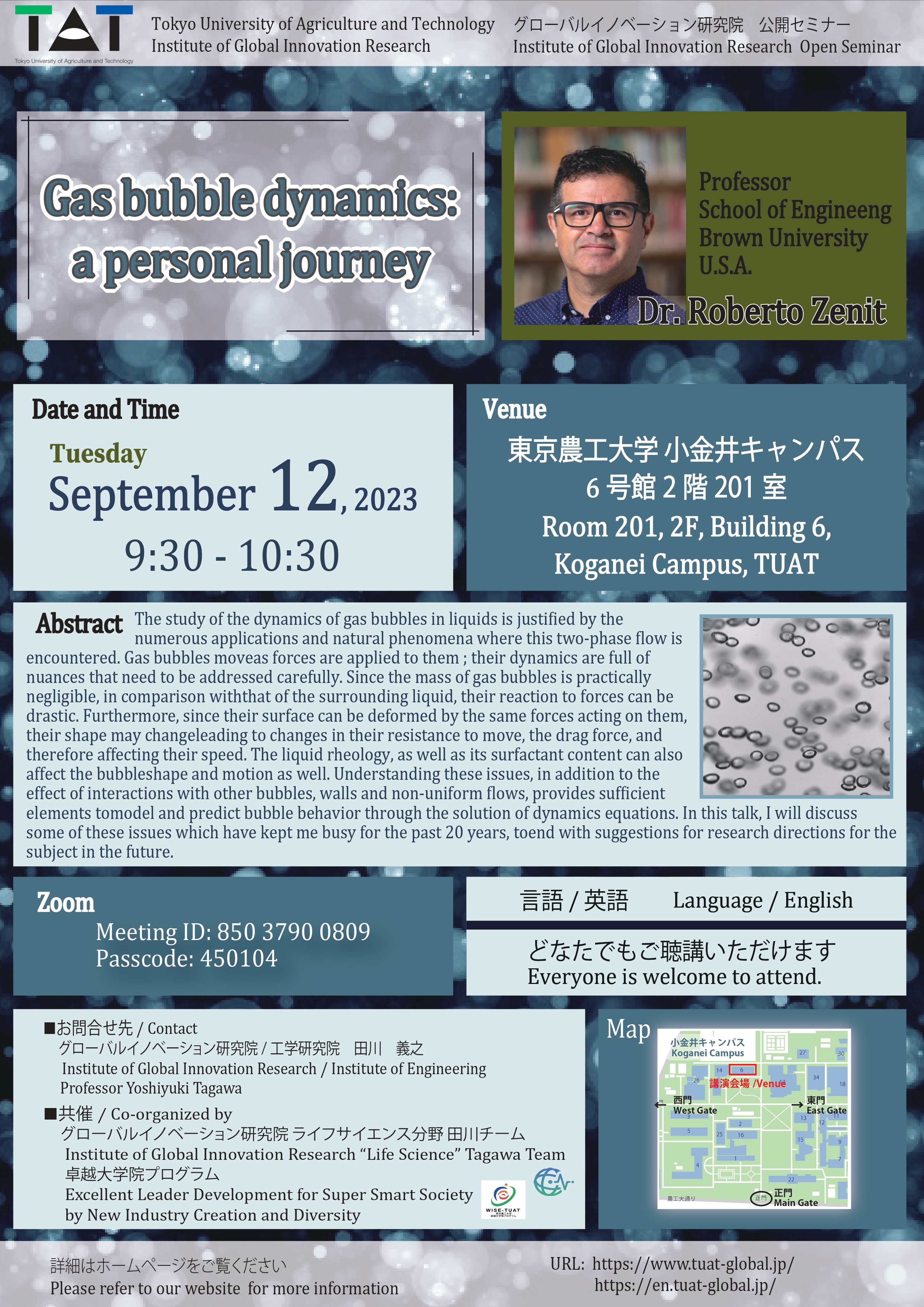 The study of the dynamics of gas bubbles in liquids is justiied by the numerous applications and natural phenomena where this two-phase low is encountered. Gas bubbles moveas forces are applied to them ; their dynamics are full of nuances that need to be addressed carefully. Since the mass of gas bubbles is practically negligible, in comparison withthat of the surrounding liquid, their reaction to forces can be drastic. Furthermore, since their surface can be deformed by the same forces acting on them, their shape may changeleading to changes in their resistance to move, the drag force, and therefore affecting their speed. The liquid rheology, as well as its surfactant content can also affect the bubbleshape and motion as well. Understanding these issues, in addition to the effect of interactions with other bubbles, walls and non-uniform lows, provides suficient elements tomodel and predict bubble behavior through the solution of dynamics equations. In this talk, I will discuss some of these issues which have kept me busy for the past 20 years, toend with suggestions for research directions for the subject in the future.