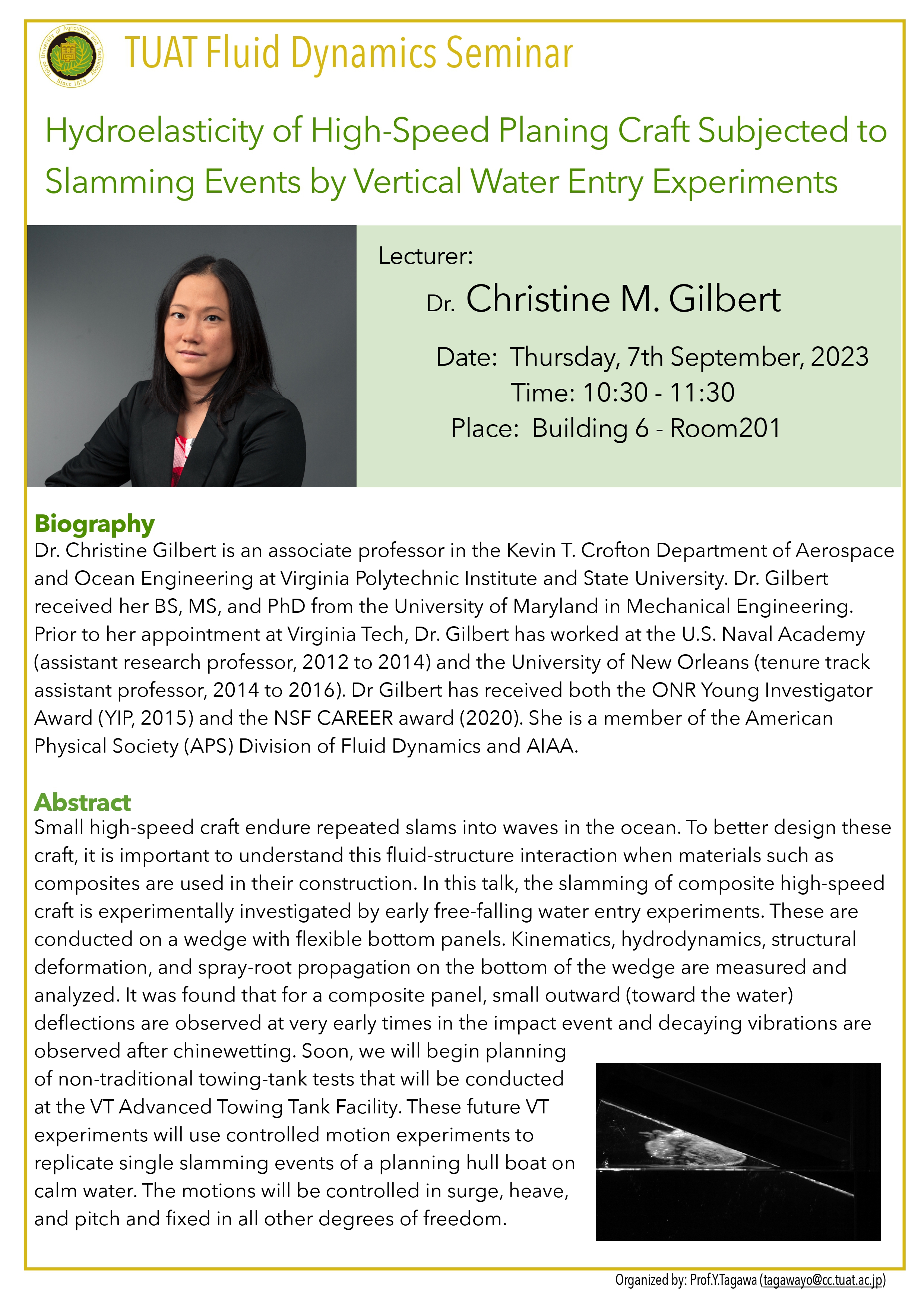 Small high-speed craft endure repeated slams into waves in the ocean. To better design these craft, it is important to understand this fluid-structure interaction when materials such as composites are used in their construction. In this talk, the slamming of composite high-speed craft is experimentally investigated by early free-falling water entry experiments. These are conducted on a wedge with flexible bottom panels. Kinematics, hydrodynamics, structural deformation, and spray-root propagation on the bottom of the wedge are measured and analyzed. It was found that for a composite panel, small outward (toward the water) deflections are observed at very early times in the impact event and decaying vibrations are observed after chinewetting. Soon, we will begin planning of non-traditional towing-tank tests that will be conducted at the VT Advanced Towing Tank Facility. These future VT experiments will use controlled motion experiments to replicate single slamming events of a planning hull boat on calm water. The motions will be controlled in surge, heave, and pitch and fixed in all other degrees of freedom.