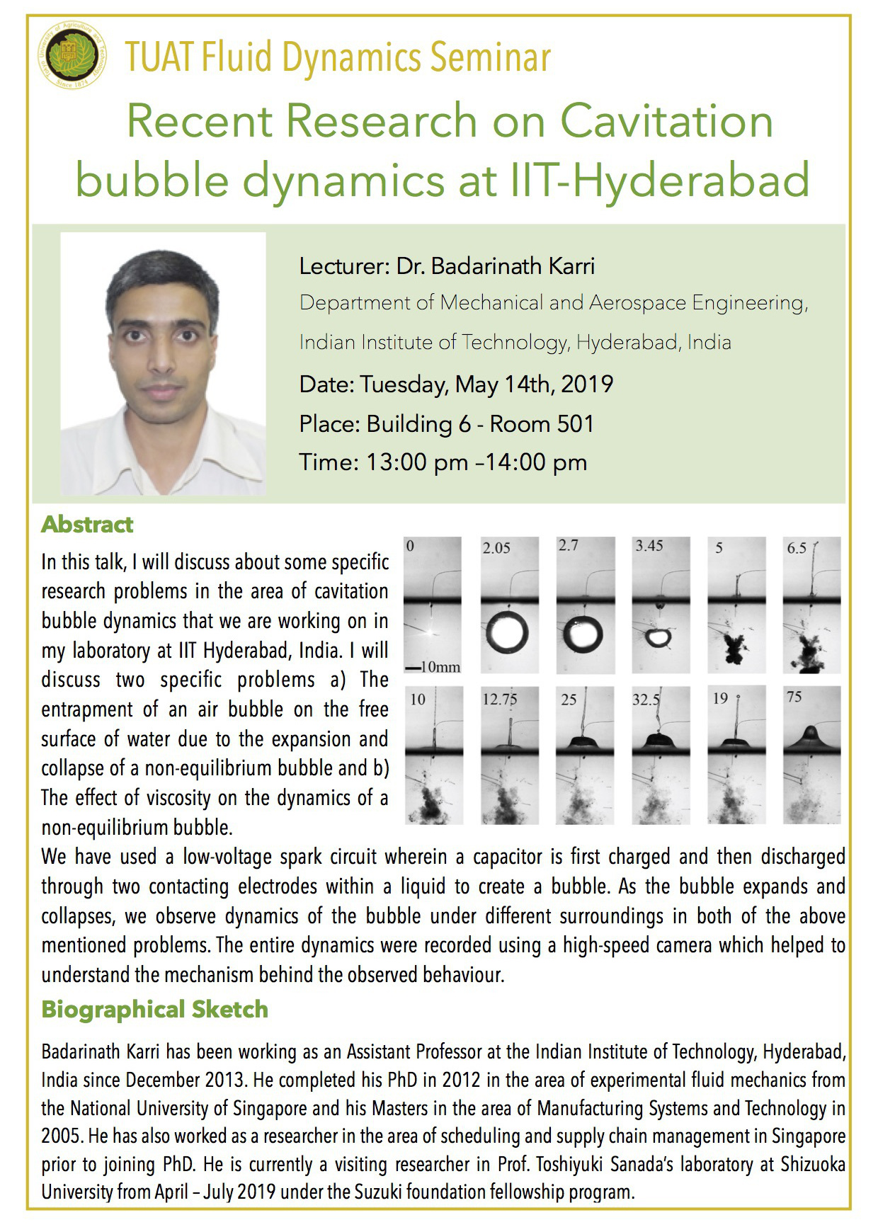 In this talk, I will discuss about some specific research problems in the area of cavitation bubble dynamics that we are working on in my laboratory at IIT Hyderabad, India. I will discuss two specific problems a) The entrapment of an air bubble on the free surface of water due to the expansion and collapse of a non-equilibrium bubble and b) The effect of viscosity on the dynamics of a non-equilibrium bubble. We have used a low-voltage spark circuit wherein a capacitor is first charged and then discharged through two contacting electrodes within a liquid to create a bubble. As the bubble expands and collapses, we observe dynamics of the bubble under different surroundings in both of the above mentioned problems. The entire dynamics were recorded using a high-speed camera which helped to understand the mechanism behind the observed behaviour.