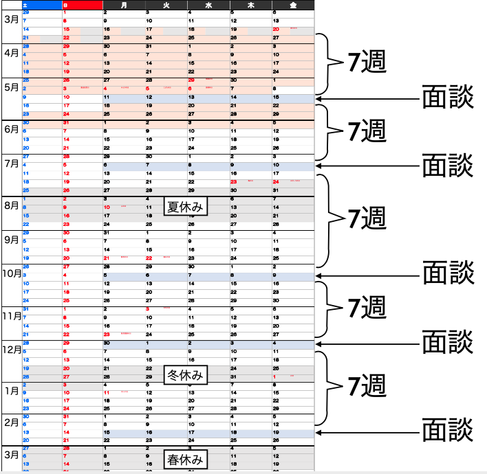 ただしこれはあくまで標準的な目安となるものであり,学生の個性,潜在能力,得意分野を最大限引き出せるように,教員が密に面談(定期的な面談は年4回以上,各1時間程度)を実施して,一人一人プログラムをカスタマイズしていきます.