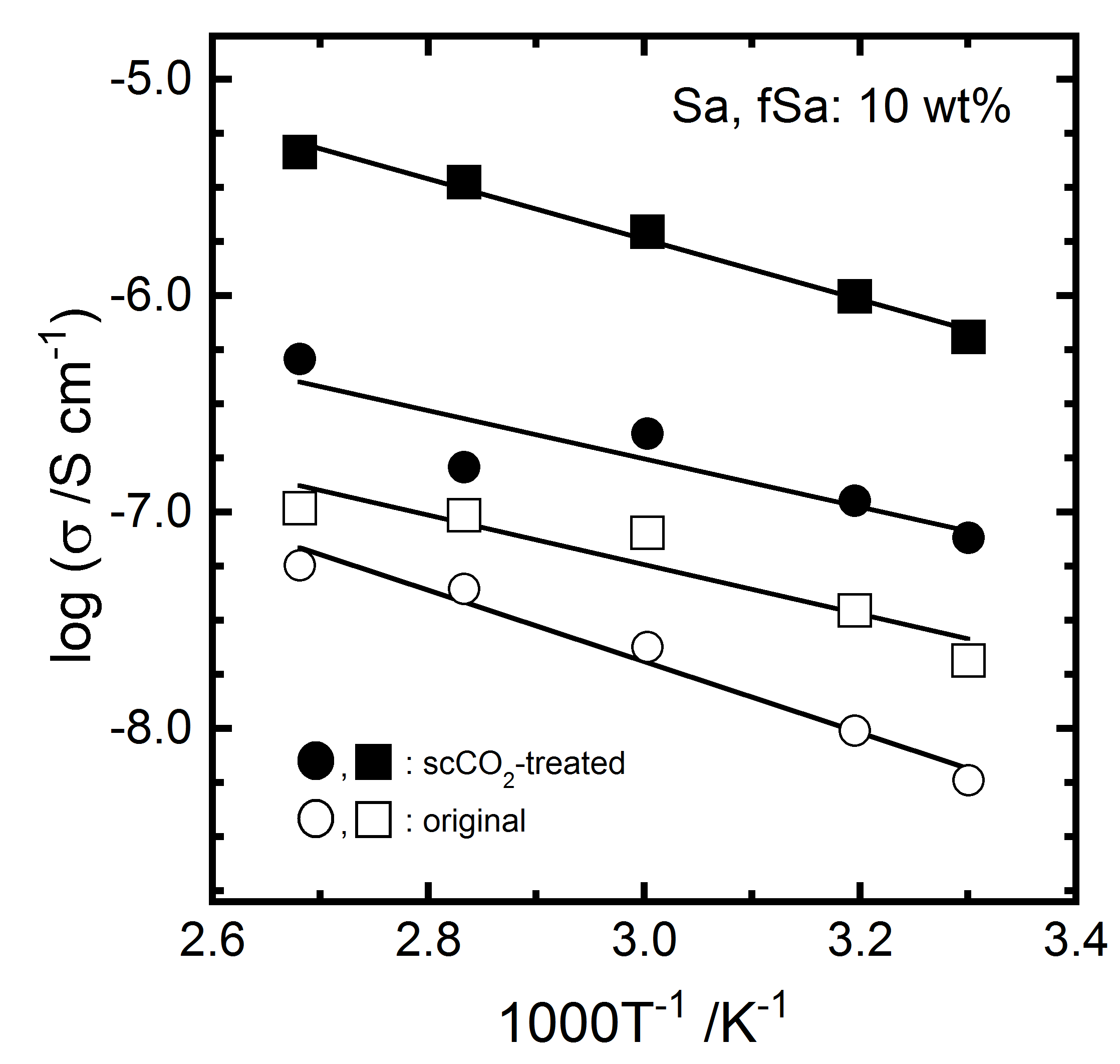 P(EO/EM2)/SaおよびfSa(10wt%)コンポジットの各種オリジナル試料およびscCO2処理試料のイオン伝導度の温度依存性を左図下に示します [3]。fSaコンポジットのオリジナル試料は、Saコンポジットよりも高いイオン伝導度を示しました。また、fSaコンポジットのscCO2処理試料は、オリジナル試料よりもイオン伝導度が約35倍向上し、凍結乾燥処理とscCO2処理を併用することでイオン伝導度を約100倍近く向上させることができました。一般的に、ポリエーテルと金属塩からなる混合物のイオン伝導は、ポリエーテル鎖の運動性に強く依存します。言い換えれば、その運動性の指標であるTgは、イオン伝導性を評価する上で重要な要素になります。ところが、P(EO/EM2)/SaコンポジットのDSC測定からは、scCO2処理前後のTgにほとんど変化がないことが分かっています。過去の研究成果を総合的に解釈すると、クレイの静電的相互作用の緩和またはイオン-双極子間相互作用の増加が、層間カチオンを効果的に解離してイオン伝導度を向上させる必須条件であると考えられます。そのため、P(EO/EM2)/Saコンポジットのイオン伝導度の温度依存性はアレニウス式に従い、P(EO/EM2)鎖のセグメント運動に依存しないメカニズムでイオン移動が発現しているのではないかと考察されます。左図下の各プロットをアレニウス式に適合させ、イオン伝導に関する活性化エネルギー(Ea)を見積もったところ、凍結乾燥およびscCO2処理によってEaが大きく減少していることが分かりました。凍結乾燥およびscCO2処理によるイオン伝導度の向上は、P(EO/EM2)とSaとの間に形成される界面の増加によってもたらされた、移動度の高いカチオンの増加が主たる要因であると推察されます [1,3]。