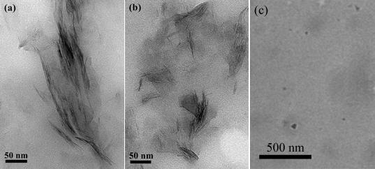 そこで、凍結乾燥およびsscCO2処理によるSaの分散性への影響を評価するために、各種オリジナル試料とscCO2処理試料(P(EO/EM2)/fSaコンポジットのみ)のTEM測定を行いました(左図中央)[3]。fSaコンポジットのオリジナル試料(b)では、Saコンポジット(a)よりも積層数が減少し、P(EO/EM2)との界面が増加しているのが分かりました。TEM像の電子密度プロファイルを解析した結果によると、層間距離がWAXD測定の結果と一致することが明らかとなりました。TEMおよびWAXD測定の結果を総括すると、凍結乾燥処理は試料中のSaの層間距離にはほとんど影響を及ぼしませんが、層の分散性を向上させる効果は有ることが分かります。一方、fSa単体はWAXD測定の結果から層構造由来の一次ピークが見られず、カードハウス構造を形成していることが示唆されました。一般的に、クレイは層表面と層間カチオン間で形成される強固な静電的相互作用により、積層構造を形成しています。凍結乾燥処理によるポリエーテル中での分散性の向上は、層表面と層間カチオン間の静電的相互作用を緩和し、P(EO/EM2)分子の層間へのインターカレーションが容易になったことを支持するものです。fSaコンポジットのscCO2処理試料のTEM像(c)からは、他で見られる繊維状のSa集合体構造は見られず、黒色領域が不明瞭で広域に分散していることが分かりました。この黒色領域は、(a)や(b)にも見られますが、そのサイズは小さくなっていることが分かります。scCO2処理効果は、凍結乾燥処理と同様に複合体中の層間距離をほとんど変化させることなく、層集合体のドメインサイズを大きく減少させると考えられます。処理中にCO2がクレイの層間に侵入した状態で圧力を解除する過程で、CO2が系外に放出される際に負電荷層を剥離させることができると報告されており、本研究の複合体中においても同様な効果が寄与している可能性が示唆されます。
