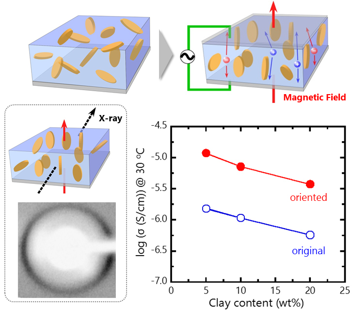 さらに富永研では、SPE中のクレイを強磁場によって配向させ、クレイの高いアスペクト比を活かした新しいSPE複合材料の創製も目指しています(左図)[2]。磁場印加試料は、オリゴオキシエチレンメタクリレート(MEO)のモノマー溶液を3 Tの磁場中に1時間室温で静置し、そのままの状態で重合を行って作製しました。クレイ(MMT)を充填した試料は、クレイ単体に比べて層間距離が拡大していることから、層間にPMEOが浸入したと考えられます。磁場印加によって試料中のクレイの層間距離がわずかに拡大しましたが、クレイを充填した試料のTgに大きな変化は見られませんでした。左図には磁場印加試料の二次元X線回折測定による回折パターン、および予想される試料中のクレイの配向イメージを示しました。オリジナル試料では、クレイの層間に基づく回折のリングが等方的ですが、磁場印加試料では膜面方向に対して垂直に配向しているクレイが多く確認されました。さらに、これらの室温におけるイオン伝導度を測定しました。磁場印加試料のイオン伝導度は、オリジナル試料よりも大きく向上しました。二次元X線回折測定の結果からは、垂直試料ではクレイが膜厚方向に対して平行な状態であることから、クレイがイオン伝導度測定方向に対して平行に配向するほどイオン伝導度が向上することが分かりました。また、イオン伝導度の温度依存性からは垂直試料の活性化エネルギーの低下が見られました。この結果は、垂直試料がオリジナル試料よりも層間カチオンが効果的に利用されキャリヤーイオンが増加したことを示しています。Liイオン輸率の結果からも垂直試料の値が向上しており、クレイの配向がカチオンのイオン伝導環境に大きく影響を与えていることが示唆されました。