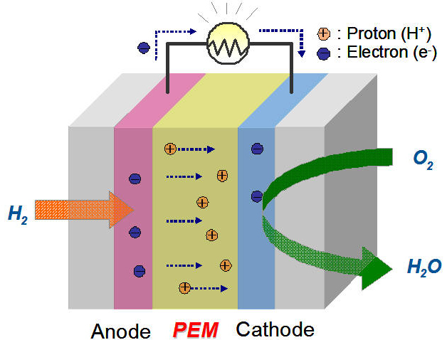 固体高分子形燃料電池(PEFC)は、低い温度(室温~100 ℃程度)における作動性、高い発電効率、小型軽量化が可能、保守が容易、比較的廉価な構成材料が利用できる、などの特徴を持つ新しい燃料電池として期待されています。PEFCの基本骨格は、プロトン伝導性高分子膜を二種の電極(多孔質)でサンドイッチした構造で、一般には燃料に水素、酸化剤に空気中の酸素を供給して、60~100 ℃の低温で作動させます。電極には、ナノサイズの白金粒子などが高分散化された状態でカーボンに担持されており、この触媒表面が反応場となって電気化学的な酸化還元反応が起きます。燃料電池の要である電解質部には、ナフィオン(Nafion®)のようなパーフルオロスルホン酸型電解質膜が使われています。この高分子膜は、DuPont社により開発されたイオン交換膜がきっかけで、優れた化学的安定性や長寿命などの特徴から、NASA宇宙計画用燃料電池として1969年の無人衛星などに搭載されました。現在、一般家庭用に広く普及している燃料電池の高分子電解質膜には、このナフィオンが多く使われています。このようなPEFCは、排出物が水のみであるため、地球環境に配慮した次世代電源の一つとも言われています。