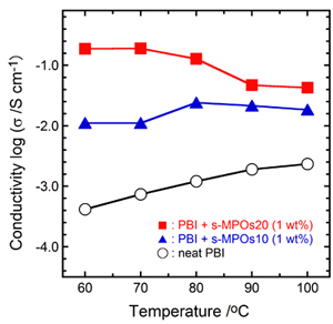 比較的安価でガスバリア性に優れるエチレン-ビニルアルコール共重合体(EVOH)をモデル高分子として、s-MPSiとの複合膜を溶媒キャスト法により作製ました [2]。得られた複合膜のプロトン伝導度を測定したところ、s-MPSi添加量の増加に従って各温度で伝導度が向上しました。
