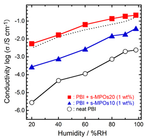 さらに、ポリベンズイミダゾール(PBI)とs-MPSiの複合膜作製と評価も試みました [1]。PBIは高耐熱性のエンジニアリングプラスチックの一種であり、リン酸などの酸を含有させることで低湿条件や無加湿条件でも作動を可能とすることに期待が持たれている材料です。リン酸含浸PBIにs-MPSiを1 wt%の割合で充填したコンポジット電解質膜のプロトン伝導度を測定したところ、上図中央および右に示すように、測定した温度・湿度範囲で伝導度が大きく向上するという結果を得ることができました。このように、プロトン伝導性電解質膜に対しても、スルホン化メソポーラスシリカの充填が伝導度向上の効果をもたらすことが分かりました。