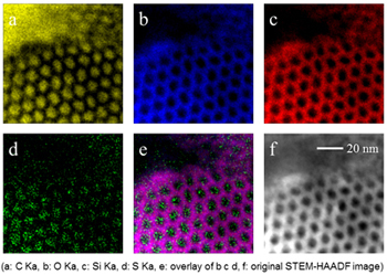 合成したs-MPSiの構造を電界放出型TEM(JEM-2200FS)およびEDSを用いて詳細に調査しました [1]。TEM用の試料作製は、s-MPSiをそのままエポキシ樹脂に包埋し、ウルトラミクロトームで均一な厚さにスライスしました。EDS分析では、スルホ基に含まれる硫黄元素(S)に注目しました。上図左のEDSマッピング画像の結果からは、各元素が明瞭に観察されています。炭素は主にエポキシ樹脂によるものであり、酸素とケイ素はMPSiの骨格を構成する元素です。SO3H基由来の硫黄(d:緑)は明瞭に確認でき、メソ細孔の内表面に局在していることが分かりました。これは、内部MPSi上に多くの有機SO3H基が存在することを示唆しています。この硫黄は、メソ細孔の外側でも観察され、MPSiドメインの外表面上の少量のSO3H基に起因する可能性があります。さらに、これらの要素のオーバーレイ画像(e)は、明らかに内表面にほぼSO3H基が存在することを示しています。