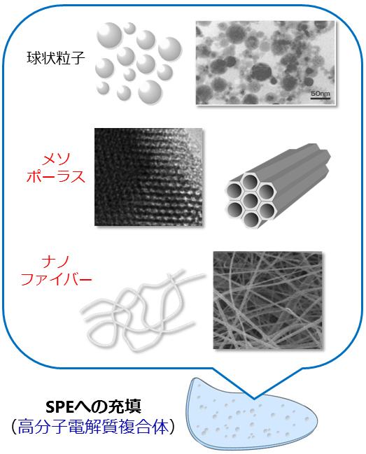 富永研では、高分子鎖の熱運動を介したイオン移動に依存しないSPEに対する無機フィラーの優れた効果に着目し、球状粒子型にかわる様々な無機フィラーのSPEへの利用を検討しています。具体的には、左図に示すように、メソポーラス型[1,2]やナノファイバー型[3-5]の無機フィラーを利用します。これらのフィラーを利用することによって、従来型の球状粒子フィラーでは実現できないSPE/無機フィラー界面の増加が可能となり、さらなるSPEのイオン伝導特性の改善が期待できます。