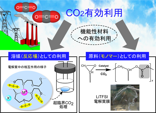 富永研では、CO2を新しい反応場(溶媒)や原料(モノマー)として有効利用することを考え、これを様々な機能性材料に応用しています。