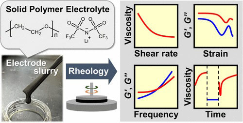 This study examines in detail the rheological properties of aqueous graphite electrode slurries containing poly(ethylene oxide) (PEO)-based SPEs, which are critical for practical deployment but have not received much attention. The results demonstrate that the development of electrodes containing SPEs necessitates careful evaluation and optimization of the rheological properties of the slurries. The present study sheds significant light on the importance of specialized knowledge and techniques to obtain accurate and useful information on the non-Newtonian fluidity and viscoelasticity of battery electrode slurries containing SPE materials.