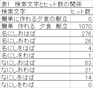 ここまでは数多くの検索結果を絞り込んで探す方法を書きましたが、逆にうまく目的のものが見つけられない場合どうしたらいいでしょうか。例えば「簡単に作れる夕食の献立」と文章で入力すると当てはまるページがありませんが、「簡単 作れる 夕食 献立」と入力するキーワードを文章ではなく単語で入力すると検索結果を得やすくなります。また百人一首の「名にしおはば」で始まる歌を検索したい場合キーワードに「名にしおはば」と入れて検索すると思います。ところがホームーページを作る人により「名にしおわば」や「なにしをはば」など書き方が異なることが考えられますので、それぞれ考え得る表記方法で検索すると今まで見つけることができなかったサイトを見つけることができるようになります。(表1)