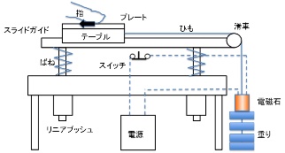 摩擦係数を測定するだけであれば、金属の歪みを測定する方法もありますが、付属の装置が少なくなるように、また原理が分かるようにと考え、この構造を考案しました。当初考えていなかった効果として、 力を入れすぎて電磁石が外れたときに、ガクッとテーブルが滑ってしまい、その瞬間に微妙な喪失感を体験できます。